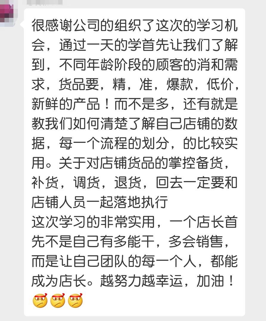 通过培训,大家纷纷表示,要把学到的知识落实到工作中,充分运用所学知识与实际工作相结合,落实到店铺,掌握销售核心,提高品牌意识,店长切实做好店铺的管理工作,为店铺的转型发展贡献自己的力量。
